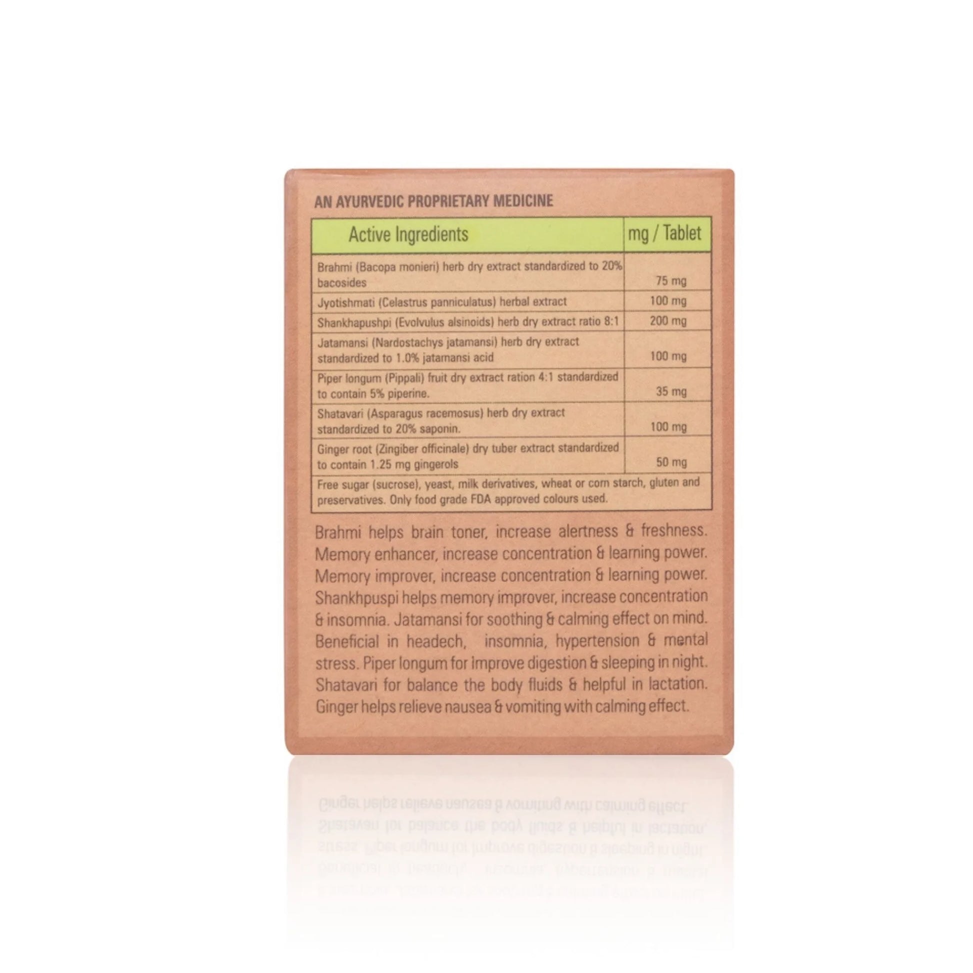 Brahmi (Bacopa Moneri) herb dry extract standardized to 20% bacosides 75 mg, Jyotishmati (Celastrus paniculatus) dry extract 100mg, Shankhapushpi (Evoluvulus alsinoids) herb dry extract ratio 8:1 200mg, Jatamansi (Nardostachys jatamansi) herb dry extract standardized to 1.0% jatanmasi acid 100mg, Pippali (Piper longum) fruit dry extract ratio 4:1 standardized to contain 5% piperine 35mg., Shatavari (Asparagus racemosus) herb dry extract standardized to 20% saponins 100mg , Ginger root (Zingiber officinale) herb dry extract ratio 6:1 50mg.