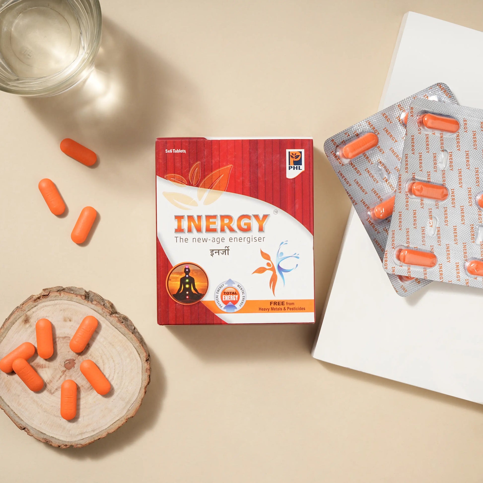 Inergy is a scientifically formulated herbal supplement designed to restore and sustain your energy levels naturally. Powered by a potent blend of Ashwagandha, Kaunch Beej, Korean Ginseng, Safed Musli, Ginkgo, and Shilajit, Inergy helps improve physical stamina, enhance mental alertness, and support overall health.