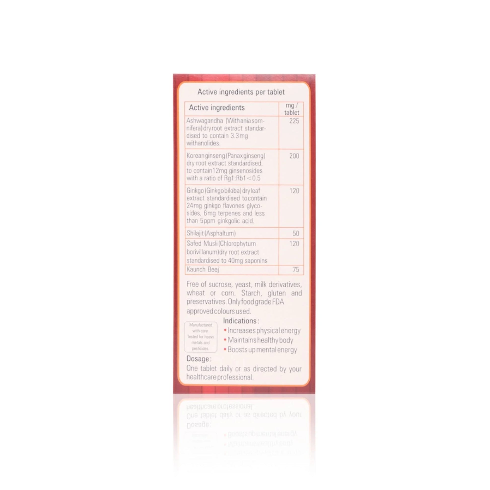 Ashwagandha (Withania Somnifera) dry root extract standardized to contain 3.3 mg withanolides 225 mg, Korean ginseng (Panax Ginseng)dry root extract standardized to contain 12 mg ginsenosides with a ratio of Rg1: Rb1<0.5 200mg, Safed musli (Cholorophytum borivillanum) dry root extract standardized to 40mg saponins 120mg, Gingko (Gingko Biloba) dry leaf extract standardized to contain 24 mg gingko flavone glycosides 6 mg terpenes and less than 5ppm ginkgolic acid 120mg, Shilajit (Asphaltum) 50mg, Kaunch Beej (Mucuna pruriens) 75mg.